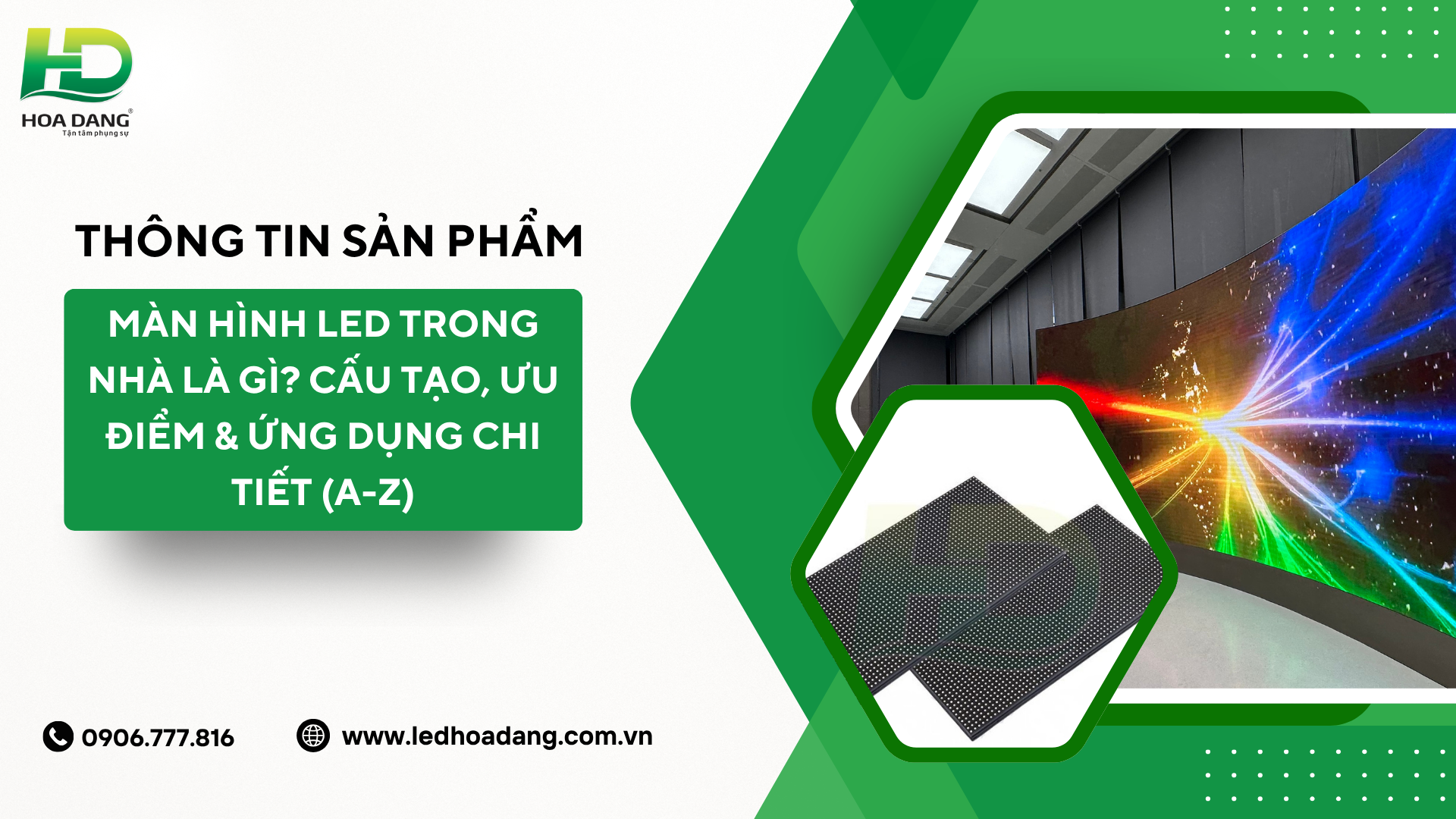 Màn hình LED trong nhà (Indoor LED Screen) là một loại màn hình hiển thị điện tử, sử dụng công nghệ Diode phát quang (LED) để tạo ra hình ảnh. Điểm đặc trưng của loại màn hình này là nó được ghép lại từ nhiều module LED nhỏ, cho phép tạo ra một màn hình lớn với kích thước không giới hạn mà không bị cản trở bởi các viền ghép (bezel) như màn hình LCD.