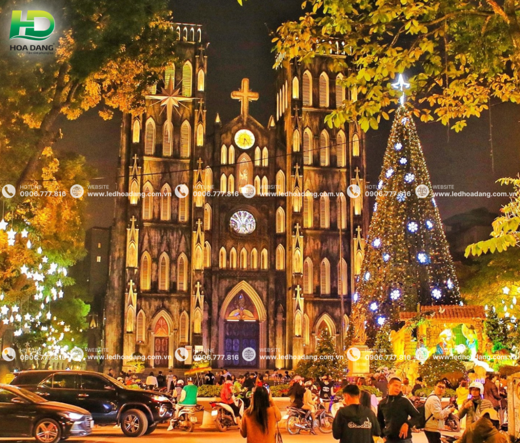 Cây thông Noel trước sảnh nhà thờ thường được trang trí bằng dòng LED Đom Đóm (Fairy Lights) với kích thước bóng siêu nhỏ nhưng mật độ cực dày, tạo hiệu ứng “bụi tiên” lấp lánh huyền ảo. Hệ thống LED Spotlight công suất lớn được bố trí khéo léo để hắt sáng mặt tiền nhà thờ, làm nổi bật các đường nét hoa văn cổ mà không làm mất đi vẻ tôn nghiêm.